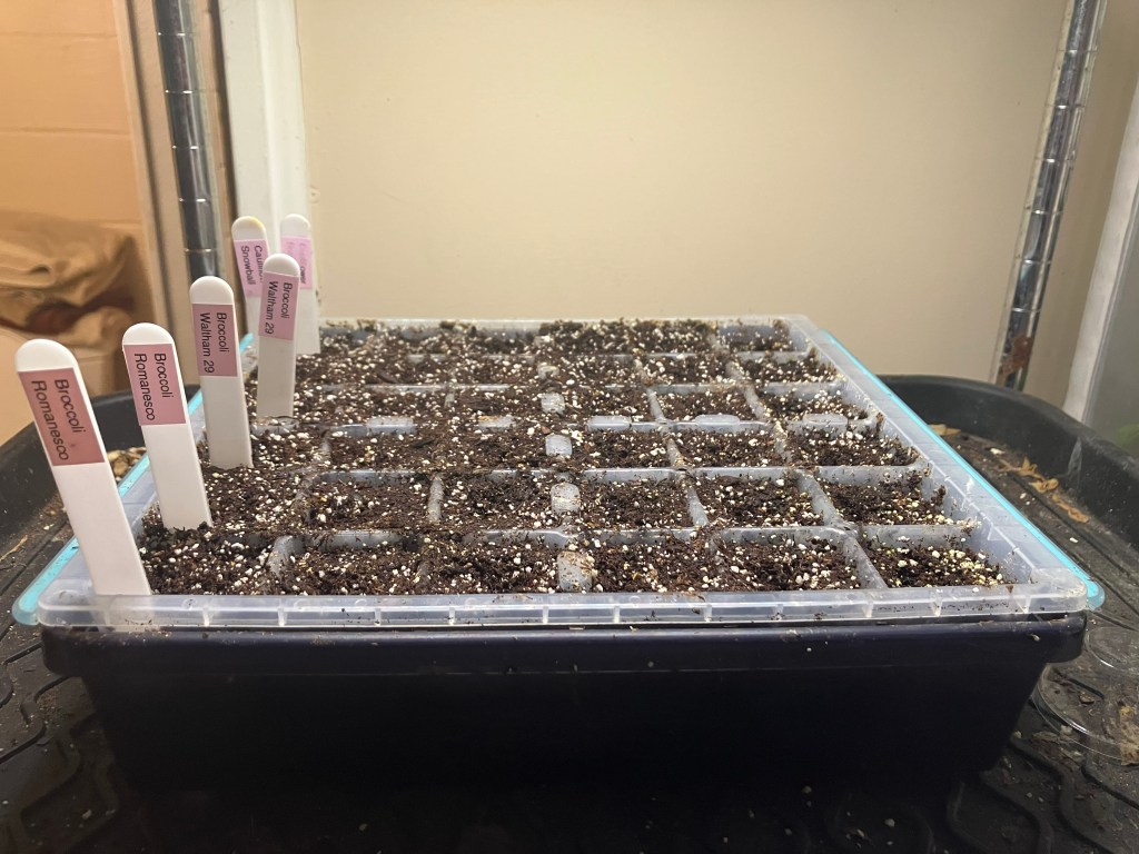 Brassicas prefer cool weather, and here in northern Ohio’s Zone 6b, the window between frosty spring mornings and summer heat waves can be surprisingly short. That means they need an early start indoors before being transplanted outside. For today’s planting, I placed the trays under grow lights set up in the basement. The lights are connected to smart plugs, which let me schedule them automatically, making the process much easier. I used a seed-starting mix and carefully labeled each row in the trays with its variety, because experience has taught me that I will not remember.